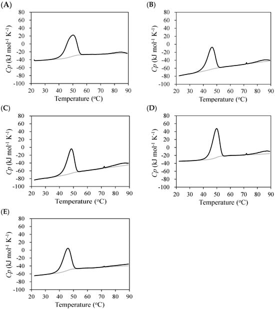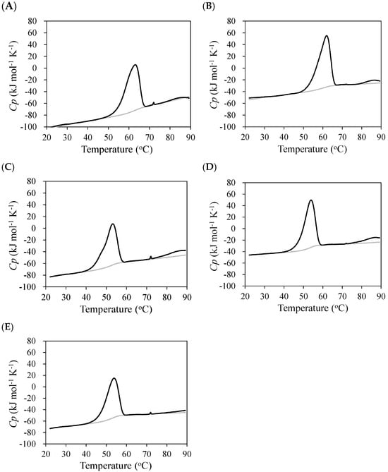 Heat capacity curves of scFvs of C6 and E11 mutants C6_R58KH (A), C6_Q100EH (B), C6_100aIH (C), C6_Q100EH/100aIH (D), and E11_Δ100aIH (E) (black line). Heat capacity curves of buffer only used for background subtraction are also indicated (gray line).