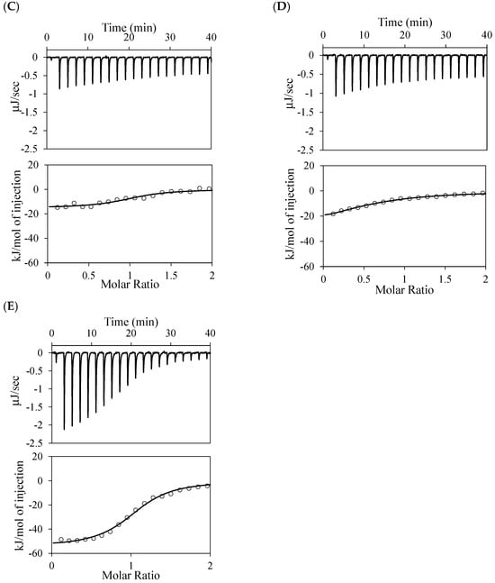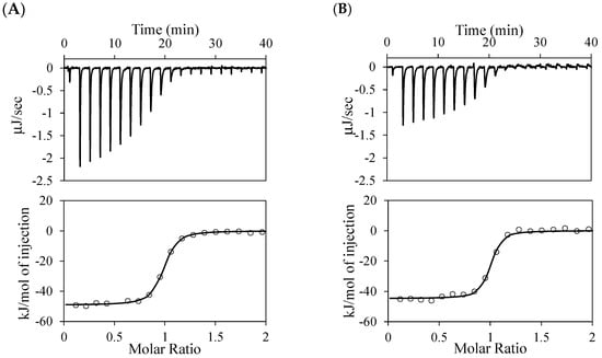 ITC measurements were carried out using an iTC200 calorimeter (Malvern Panalytical, Tokyo, Japan), as described previously []. The solution of NP-Gly or NNP-Cap (100 or 200 μM) was titrated into the scFv solution (10 or 20 μM) at 25 °C. The heat for each injection was integrated and was divided by the moles of antigen injected. The analysis using Origin software 7.0 provided three parameters: binding stoichiometry (n), equilibrium association constant (Ka), and binding enthalpy change (∆H). The binding Gibbs free energy (∆G) was determined from the equation ∆G = −RT ln Ka, and the binding entropy change (∆S) was determined from the equation ∆G = ∆H − T∆S.