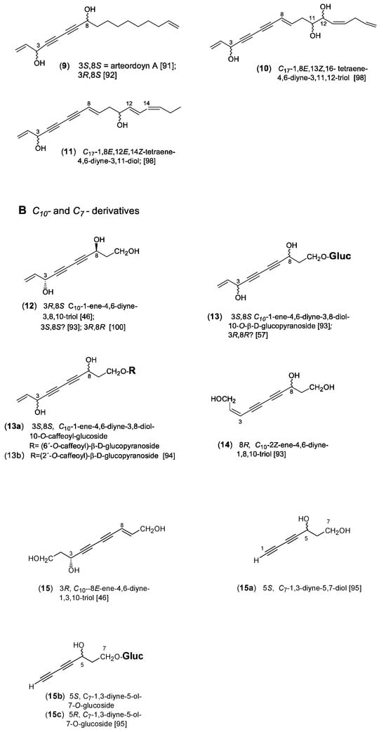 Further structural modifications, shown in compounds (811) (Figure 2), can be explained by intra-chain oxidation and conjugase activity [4]. Chain-shortening to the structurally related C10-derivatives (1215) (Figure 2) is supposed to be formed either via β-oxidation steps, or, regarding the co-existence of compounds (8) and (15) in A. halodendron [46], by a mid-chain cleavage [1]. Since only few glycosylated acetylenes are known so far, the formation of 10-O-glucoside (13) in the aerial parts of the three related species A. monosperma [57], A. capillaris [93], and A. scoparia [94] is of chemotaxonomic interest. In A. scoparia, two isomeric caffeoylated glucosides (13a,b) additionally contribute to the structural diversity of this type of acetylenes [94]. Moreover, from the aerial parts of A. dracunculus, three C7-diynes (15ac) were isolated [95]. With respect to the already known tri-hydroxylated C10-diyne (15), they may be regarded as a result of an additional C3-cleavage.