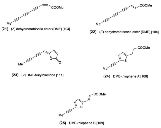Figure 4. C10-acetylenes derived from dehydromatricaria ester (DME) [104,108,109,111].