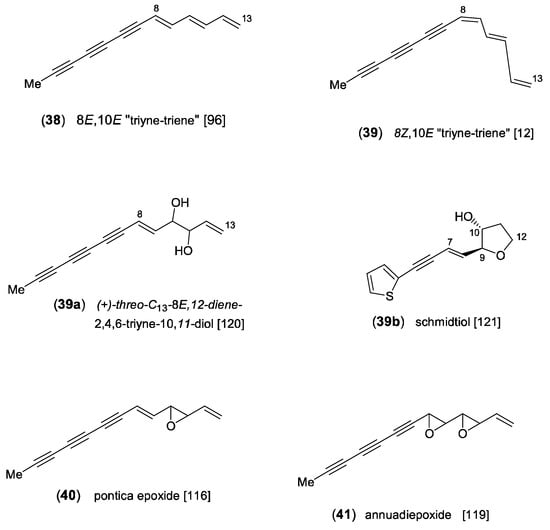 The C13-acetylene “triyne-triene” (38) is characterized by a fully conjugated system derived from a triyne-diene-diol intermediate (Scheme 3). It was initially isolated from the roots of Achillea ptarmica L., and its characteristic UV spectrum was detected in many species of the tribe Anthemideae [96]. In the genus Artemisia, compound (38) was frequently reported for the “Vulgares” [13] and especially characterized species of the “Abrotana” group. As already pointed out for centaur X3 (16), the central (E)-configurated double bond, conjugated with three triple bonds, easily isomerizes to the (Z)-isomer (39) [12]. The widespread oxidation product (40) was detected in different genera of the Anthemideae and represents the first naturally occurring polyacetylene-epoxide. It was first isolated from the underground parts of A. pontica L. and named pontica epoxide (PE) [116]. From the aerial parts of A. annua L., pontica epoxide (40) was also isolated as a major component along with a highly unstable diepoxide, named annuadiepoxide (41) [119]. In addition, the aerial parts were shown to contain the corresponding diol (39a) [120]. The inclusion of sulfur and demethylation lead to the C12-thiophene schmidtiol (39b), isolated as a minor component from the aerial parts of A. schmidtiana Maxim. Biogenetically, it is probably derived from a corresponding 12-hydroxy-9,10-epoxide precursor [121] (Figure 6).