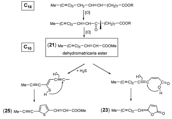 A frequently occurring polyacetylene of Artemisia is the methyl ester of C10-triyne-enoic acid, named dehydromatricaria ester (DME). The (Z)-isomer (21) was discovered as a readily crystallizing compound in the essential oil of the roots of A. vulgaris [85], and its structure was later determined by Bohlmann and Mannhardt [104] (Figure 4). The formation of DME was proposed to be the result of a direct C8-cleavage from a C18-triynoic acid precursor (Scheme 2). The (E)-isomer (22), initially obtained by synthesis, was originally isolated from the genus Tripleurospermum (published as Matricaria) [105] and was later found to be very common in the tribe Anthemideae [1]. Examining the seasonal variation of (Z/E)-isomerism, it was shown that the (Z)-isomer (21) is the dominating compound in the roots of A. vulgaris, with increasing amounts from July to October [106]. However, a comparative analysis of 78 different samples of the Artemisia “Vulgares” group revealed a species-specific trend of accumulating either the (Z) (21)- or the (E)-isomer (22), suggesting a genetically fixed mechanism [13]. The isomers of a related butyrolactone were reported to be also common in the tribe Anthemideae [1]. However, in Artemisia, only small amounts of the (Z)-isomer (23) [107] (Figure 4) could be detected so far in the “Vulgares” group [13]. Further structural variation of DME is created by the incorporation of sulfur, leading to the formation of thiophenes [108,109] (Scheme 2). The dihydro-derivative DME-thiophene A (24) was isolated from the roots of two European samples of A. absinthium L. (“wormwood”) [108]. It was later also detected in a sample originating from China together with DME-thiophene B (25). In this case, the two DME derivatives were reported to coexist with a series of C12-dithiophenes [109]. However, this type of thiophene is unknown from the genus Artemisia and has not been detected in the tribe Anthemideae. Moreover, regarding the occurrence of DME-derived thiophenes in A. absinthium, the biogenetically deviating structure of a new C10-acetylenic thiophene in this species [110] should be reconsidered.