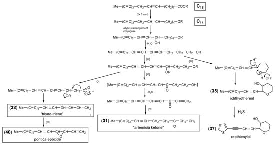 The C14-triyne-ene ketone (31) represents a typical polyacetylene of the tribe Anthemideae also widespread in the genus Artemisia [1,12,13]. Together with centaur X3 (16) and DME (21), it was originally detected in the roots of A. vulgaris, and its UV spectrum suggested the presence of a triyne-ene chromophore [85]. Due to the keto group at an unusual position, the structure could be elucidated only after extensive experiments and was named “artemisia ketone” (AK) [112]. However, this trivial name was already used first for an irregular monoterpene. The biosynthetic sequence leading to an oxygen in a not-allylic position was proposed by Bohlmann et al. [1,113] (Scheme 3). The corresponding alcohol (32) was first described for the roots of Anacyclus pyrethrum [107] and was also found to be common in the tribe Anthemideae. Its acetate (33) and the isovalerate ester of the structurally related keto-alcohol (34) were isolated from different species of the Artemisia “Vulgares” group [12,13]. Important key intermediates in this biosynthetic pathway are the C14-triyne-diene-alcohols (26) and (28) (Figure 5). They lead to the formation of the tetrahydropyrane ichthyothereol (35), its acetate (36) [23], and the thiophene repthienylol (37) from A. reptans C. Sm. [114] on the one hand and to the chemotaxonomically important C13-derivatives “triyne-triene” (38) and pontica epoxide (40) on the other. The alcohol (26) and its acetate (27) are widely distributed in the tribe Anthemideae [7] and were frequently detected in the Artemisia “Vulgares” group [13]. The co-existence of the two acetates (27) and (30) in A. afra Jacq. together with compounds (31, 36, 38) and (40) (Figure 5 and Figure 6) [115] underlines the biogenetic connections demonstrated in Scheme 3.