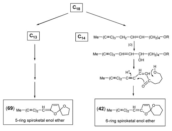 The formation of spiroketal enol ethers represents a typical chemical character of the tribe Anthemideae and plays a dominant role in the acetylenic profiles of many Artemisia species [7,9,13]. Biogenetically, the bicyclic structure is derived from a linear triyne-ene alcohol and is transformed via a ketoalcohol intermediate [122,123] (Scheme 4). Due to their characteristic UV spectra with only weakly defined broad maxima, they can be clearly distinguished from other acetylenes (graphics in [1] and especially in [13]). They were isolated either as C14-six- or C13-five-membered ringenol ethers with stereochemically complex structures [124,125]. Both were reported to co-occur in A. pedemontana Balb., where the 6-ringenol ethers dominated in the aerial parts and the 5-ringenols in the roots [126]. In the first report on structure elucidation, Bohlmann et al. [127] described the isolation of the (E)-configurated 6-ringenol ether (42) from Tanacetum vulgare L. and the corresponding 5-ringenol ether (69) from Matricaria discoidea DC. (syn.: M. matricarioides) together with the (Z)-isomers (43) and (70), respectively. Structural variation is created by ester groups mostly attached at position C-13 of the six-membered oxane ring (Figure 7). The (E)-acetate (44) and the (E)-isovalerate (46) were isolated from A. pedemontana along with small amounts of the (Z)-isomers (45) and (47). All ester groups were shown to be uniformly attached at C-13 in axial orientation [126]. Further modification was reported for A. caruthii Wood with an acetoxy group attached at the C-11 position (48) [12].