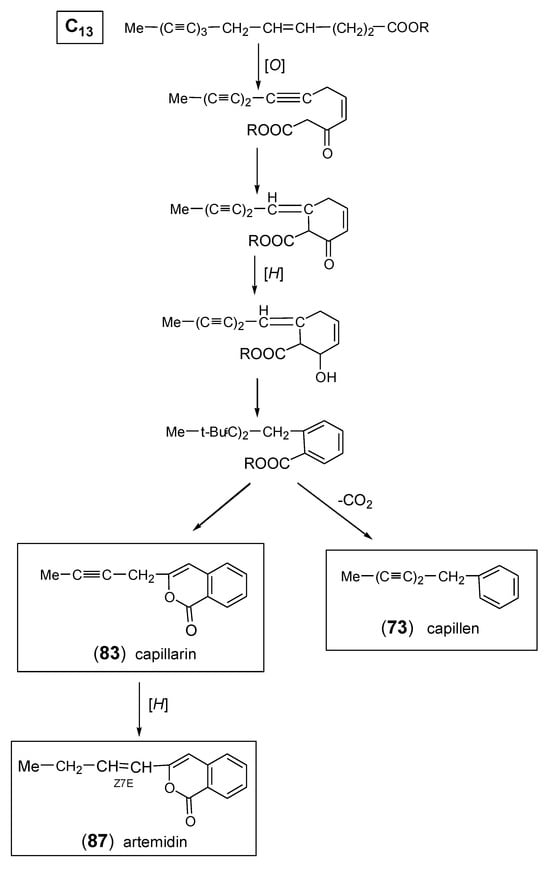Feeding experiments have shown that all aromatic acetylenes detected in Artemisia and in the tribe Anthemideae are derived from a linear C13-triyne-enoic precursor. As demonstrated in Scheme 5, the most important biosynthetic steps were proposed to be β-oxidation followed by a “Michael addition” leading to a cyclized ketoester, which is further converted to an aromatic intermediate. This aromatic ester represents the precursor of both the phenyl-diynes and the isocoumarins (Figure 8) [1,14]. The first aromatic acetylenes were isolated from the essential oil of A. capillaris Thunb. and were identified as the phenyl-diynes capillen (73) [135] and capillin (77) [22]. In following GC/MS analyses of A. capillaris, the related derivatives capillon (79) [136], neocapillen (76), capillanol (80), and o-methoxycapillen (75) were also detected, from which (76) was supposed to be an artifact of (73) created by UV-irradiation [137,138,139]. Neocapillen (81), characterized by an acetylenic end group, was isolated from the lipophilic root extract of A. dracunculus L. [140]. In addition, capillinol (78) was later obtained from A. capillaris collected in Korea [141]. From the aerial parts of A. ordosica Krasch., o-hydroxycapillen (74) was isolated, together with arteordoyin B (82) [91]. Compound (74) was originally isolated from Chamaemelum fuscatum (Brot.) Vasc. (=Anthemis fuscata Brot.), and its structure was elucidated by Bohlmann and Zdero [142]. The structure of arteordoyin B (82) (Figure 8) with an aromatic carboxy group and an enol functionality in the side chain can be regarded as a biogenetic precursor of isocoumarins (Scheme 5) [91].