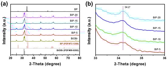 The phase structures of BP, BiOBr, and BiP heterojunctions were analyzed using XRD. The XRD presented in Figure 1a demonstrate that both pristine BP and BiOBr exhibit high crystallinity, as evidenced by the close alignment of all diffraction lines with the standard reference patterns for BP (PDF#73-1358) and BiOBr (PDF#09-0393) [28,29]. The diffraction lines of BP observed at 34.2° and 35.0° correspond to the (040) and (111) crystal planes, respectively. Notably, the intensity of the (040) reflection is significantly greater than that of the (111) reflection. This disparity suggests the prominence of the {010} crystal planes, as documented in previous studies [30,31]. Such findings imply a potential preferential growth orientation of the {001} crystal planes of BP. The presence of diffraction lines from BiOBr in the BiP heterojunctions was anticipated. The observed broadening of the diffraction lines for BiOBr and BiPs indicates the presence of small crystallite sizes. However, only the diffraction peak of BP at 34.2° is detected in the BiPs samples, suggesting a low content of BP in the heterojunction. Importantly, the intensity of the diffraction peak at 34.2° gradually increases with the rising content of BP nanosheets (Figure 1b).
