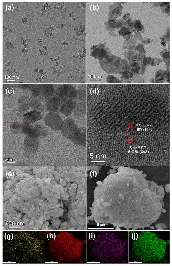 TEM images of (a) BP nanosheets, (b) BiOBr nanosheets, (c) BiP-10 heterojunction, and (d) HRTEM of BiP-10 heterojunction. SEM images of (e,f) BiP-10 heterojunction, and element mapping images of (g) O, (h) Br, (i) P, and (j) Bi.