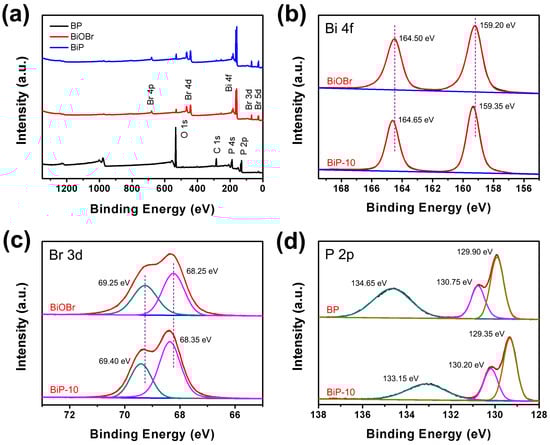 The chemical compositions of BP, BiOBr, and BiP-10 were analyzed using XPS. The XPS survey spectrum of BP, as illustrated in Figure 3a, indicates that the sample primarily contains P and O, with the oxygen arising from the surface oxidation of BP nanosheets. In contrast, BiP-10 predominantly comprises P, O, Bi, and Br, confirming its composition as a combination of BP and BiOBr. This finding validates the successful formation of a BP/BiOBr heterojunction. Notably, the peak intensity of oxygen significantly decreased in BiP-10, suggesting that the formation of heterojunctions effectively inhibits the surface oxidation of BP. Furthermore, the high-resolution Bi 4f spectra of the BiOBr and BiP-10 samples (Figure 3b) exhibit two distinct peaks corresponding to Bi 4f5/2 and Bi 4f7/2 [32]. Notably, these peaks shift from 159.20 eV and 164.50 eV in BiOBr to 159.35 eV and 164.65 eV in BiP-10, respectively. A similar phenomenon is observed in the Br 3d spectra of BiOBr and BiP-10 (Figure 3c). The two peaks corresponding to Br 3d3/2 and Br 3d5/2 in BiOBr, located at 68.25 eV and 69.25 eV, shift to 68.35 eV and 69.40 eV in BiP-10, respectively [33]. In the XPS spectra of P 2p in BP (Figure 3d), three distinct peaks at 129.90 eV, 130.75 eV, and 134.65 eV correspond to P 2p3/2, P 2p1/2, and oxidized phosphorus, respectively [34]. These peaks shift to 129.35 eV, 130.20 eV, and 133.15 eV in the BiP-10 heterojunction. Generally, variations in the binding energy of an element reflect changes in its electron density [35,36]. When an atom gains electrons, its binding energy decreases; conversely, the binding energy increases when an atom loses electrons. Therefore, the observed changes in the binding energies of Bi 4f, Br 3d, and P 2p suggest that electrons are transferred from BiOBr to BP in the BiP-10 heterojunction [37].