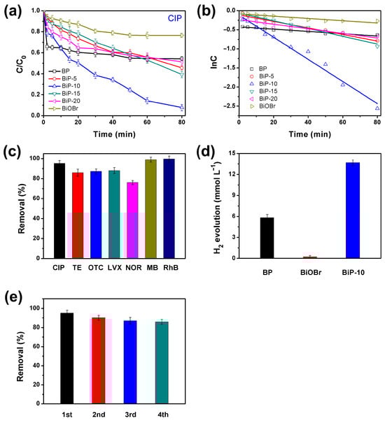 (a) Photocatalytic degradation of CIP over BP, BiOBr, and BiP heterojunction under 40 W white LED irradiation and (b) corresponding apparent rate constants. (c) Removal rate of different antibiotics and dyes over BiP-10. (d) Photocatalytic hydrogen evolution performance over BP, BiOBr, and BiP-10. (e) Recycling experiments of CIP degradation over BiP-10.