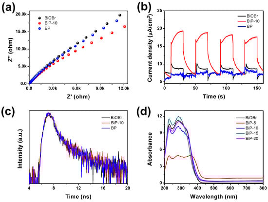 The separation and transfer of photogenerated charges are critical factors influencing photocatalytic efficiency. The construction of BiP heterojunctions can significantly enhance this process, as demonstrated by the EIS Nyquist plots in Figure 5a. BiP-10 exhibited a smaller arc radius compared to BiOBr and BP, indicating lower interfacial resistance for charge transfer in BiP-10 [39]. Furthermore, the separation and migration of photogenerated charges in the samples were confirmed through transient photocurrent measurements (Figure 5b). The results indicate that BiP-10 displayed a superior photocurrent response compared to pristine BiOBr and BP, suggesting that BiP heterojunctions offer higher charge transfer efficiency [40]. Time-resolved photoluminescence (TRPL) spectra were conducted to analyze the lifetime of photogenerated charges in BiOBr, BP, and BiP-10 [41]. These decay spectra were fitted using a biexponential function. The average PL lifetimes for BiOBr, BP, and BiP-10 were 2.72 ns, 2.88 ns, and 3.11 ns, respectively. Notably, BiP-10 exhibited a longer lifetime compared to both BiOBr and BP, indicating an extended relaxation time for the photogenerated charges. The results from the EIS spectra, transient photocurrent measurements, and time-resolved PL spectra confirmed that the recombination of photogenerated charges in BiP-10 was effectively suppressed. This suggests that the formation of the BiP heterojunction facilitates charge separation and reduces the recombination of photogenerated charges, thereby enhancing photocatalytic activity.