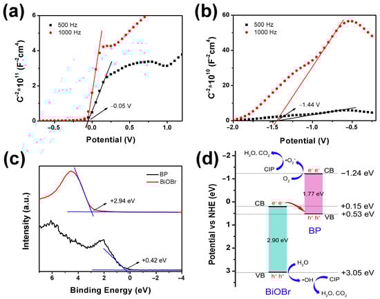 The band structures of BiOBr and BP were determined using Mott–Schottky plots and VB-XPS spectra, which significantly influenced the photocatalytic activity of the catalysts. The flat band potentials of BiOBr and BP were assessed using Mott–Schottky curves. As depicted in Figure 6a,b, the flat band potentials were −0.05 eV and −1.44 eV relative to Ag/AgCl, respectively. The corresponding standard hydrogen electrode (NHE) potentials were calculated according to the method reported in the literature [43], yielding values of +0.15 eV and −1.24 eV, respectively. Notably, both BiOBr and BP exhibited positive slopes, indicating their characteristics as n-type semiconductors. Typically, the flat band potential of an n-type semiconductor is found to be close to the conduction band (CB) position. Therefore, the CB potentials of BiOBr and BP were approximately +0.15 eV and −1.24 eV relative to NHE, respectively. The valence band (VB) positions of BiOBr and BP were determined using XPS VB spectra, which were +2.94 eV and +0.42 eV, respectively. The respective VB potentials of BiOBr and BP (vs. NHE) were evaluated based on the reported method [44], resulting in +3.05 eV and +0.53 eV, respectively. The band gaps calculated from the CB and VB values for BiOBr and BP were 2.90 eV and 1.77 eV, respectively. The result for BiOBr was consistent with the band gap derived from UV–Vis DRS spectra, as illustrated in Figure 5d. Additionally, the band gap of 1.77 eV for BP indicates that BP possesses a thin-layer structure, which is attributed to the thickness-dependent band gap of BP [45,46]. The diagram illustrating the band structure of BiOBr and BP is presented in Figure 6d.