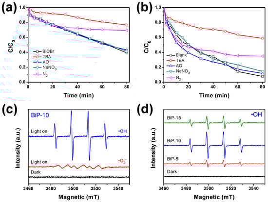 The impact of radical scavengers on the photocatalytic degradation of CIP using (a) BiOBr and (b) BiP-10 under 40 W LED irradiation, (c) the ESR spectra of DMPO-•O2− and DMPO-•OH for BiP-10, and (d) the ESR spectra of DMPO-•OH with BiP-5, BiP-10, and BiP-15 under simulated solar light.