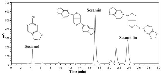 Ethanol (Taiwan Tobacco and Liquor Corporation, Taipei, Taiwan), methanol (100%, J.T. Baker, 9093-68, Phillipsburg, NJ, USA), glacial acetic acid (100%, J.T. Baker, 9508-03, Phillipsburg, NJ, USA), sesamol (Sigma, 128708, St. Louis, MO, USA), sesamin (Sigma, 9314, St. Louis, MO, USA), sesamolin: 97% purity, isolated and purified from sesame meal.