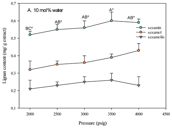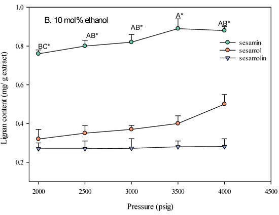 Effect of SC-CO2 pressure on the lignan content of sesame meal extracts (extraction conditions: 10 mol% EtOH, 100 NL, 60 °C). Values are presented as means ± SD (n = 3). Means, for the same lignin content but different extracted pressure, with different uppercase letters, respectively, were significantly different based on Duncan’s multiple range test (p < 0.05). An asterisk (*) means significant (p < 0.05) differences between the same extracted pressure and different lignin contents assayed by a one-way ANOVA, followed by an unpaired Student’s t-test.