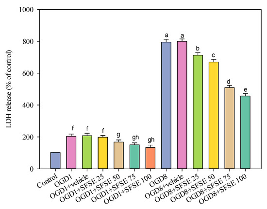 The effect of OGD1 (1 h), OGD8 (8 h), and SFSE (25, 50, 75, 100 μg/mL extract) on LDH release, indicating effective prevention of LDH release after 1 and 8 h OGD due to the pre-treatment with 50 μM of LY294002. Meaning, for the OGD test but treated with different SFSE concentrations, they are indicated by different lowercase letters. Data are presented as mean ± SEM of six independent experiments; OGD: oxygen–glucose deprivation, LDH: lactate dehydrogenase, LY: LY294002, SFSE: supercritical fluid sesame extract, 4000 psi, 100 NL, 10 mol% EtOH, 60 °C.