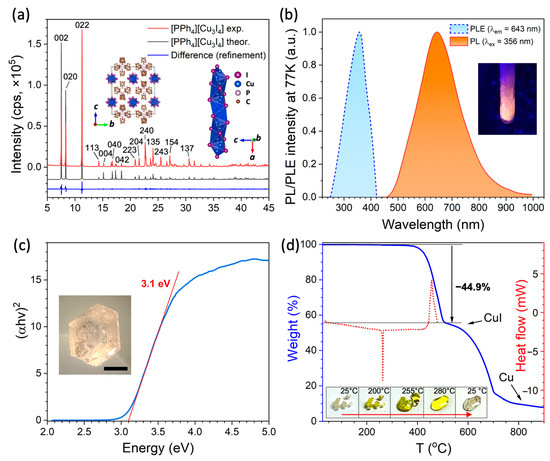 (a) X-ray diffraction pattern of [PPh4][Cu3I4], (b) PLE and PL spectra measured at 77 K, (c) absorption spectrum in Tauc coordinates and inset with photo of crystal (scalebar is 0.3 mm), (d) TG/DSC curves with inset image of melting crystals.