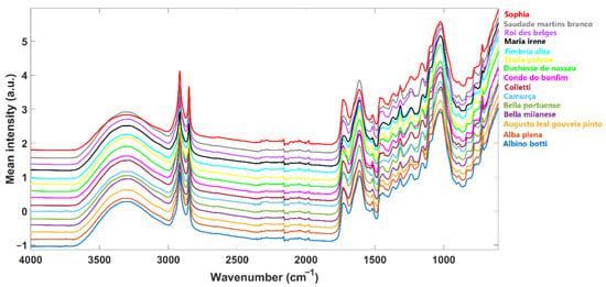 Fourier transform infrared with attenuated total reflectance (FTIR-ATR) spectra of C. japonica air-dried leaves were acquired on a Fourier transform PerkinElmer Spectrum BX FTIR Systemspectrophotometer (Waltham, MA, USA) with a DTGS detector. Spectra were acquired in diffuse reflectance mode through a PIKE Technologies Gladi ATR accessory (Madison, WI, USA) from 4000 to 600 cm−1, with a 4 cm−1 resolution. Each spectrum resulted from 32 scan co-additions. A small portion of the powder was transferred to the ATR crystal for each sample, and a pressure of 150 N·cm−2 was applied. This procedure was repeated three times for each sample. The ATR crystal was cleaned, and a background was acquired between each sample. NIR spectra were previously acquired. For details, please see the study of Sousa et al. 2024 [5]. Both spectra were stored in an Excel file of 228 entries (spectral data of 15 C. japonica cultivars) with a spectral resolution of 1556 bins for NIR data and 1701 for FTIR-ATR data. The mean FTIR-ATR spectra of each class are presented in Figure 1.