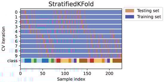 During the iterative process of FF-PCA, data were presented to the entries of 10 predesigned scikit-learn ML models [15] with different configurations (see Table 2 for more information). A stratified 10-fold cross-validation process was employed, as illustrated in Figure 3, to identify the best model for the discrimination task. This method ensures that each fold of the dataset maintains the same proportion of class labels, providing a more reliable estimate of model performance compared to standard k-fold cross-validation [16]. The Python code for Approach 2 was upload to GitHub and is freely available at https://github.com/pmrodri/Cammelia-Dataset.git, accessed on 22 January 2025 (including the dataset).