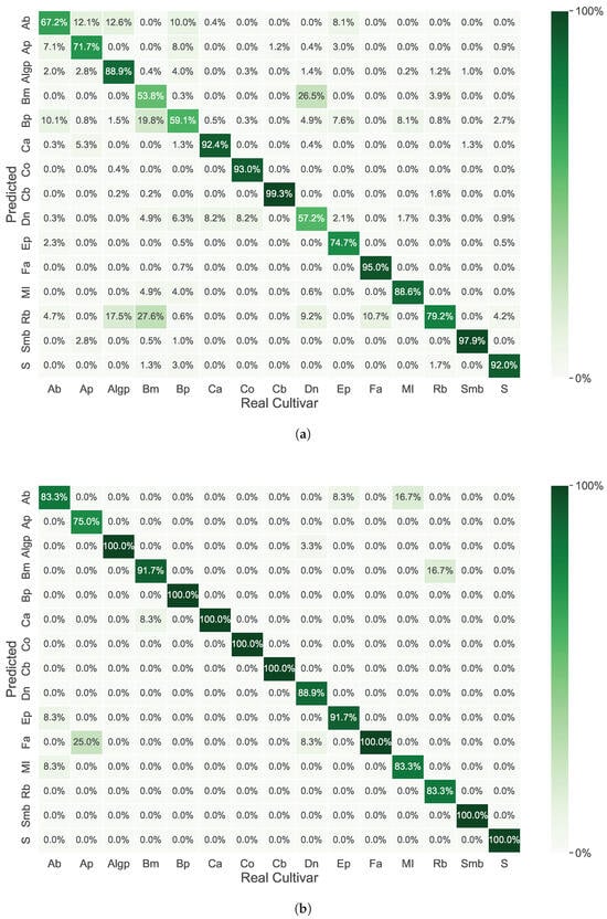 Figure 4a presents the correct cultivar assignments obtained with the NIR spectra presented in the study of Sousa et al. 2019 [5] (just for a comparison with the results presented). The authors used an 83.4% [spectral region between 6076 and 5380 cm−1 and 4956–4030 cm−1 with 17LVs and a pre-processing combination of SNV and SavGol(17,2,1)] to achieve the best discrimination results. The best predicted cultivar was Conde do bonfim (99. 0%), while the worst one was Bella milanese (52.4%).