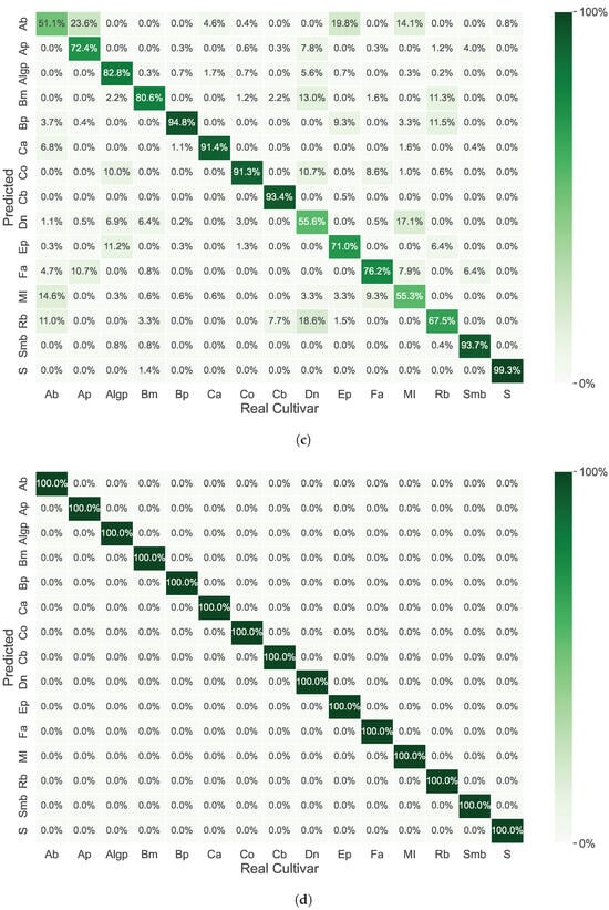 Confusion matrices with prediction accuracy in percentage (%) of the discrimination processes per each approach and used data modality (NIR and FTIR-ATR). (a) Discrimination results obtained in Sousa et al. 2019 study date from [5]; (b) NIR—Approach 2: GaussianNB discrimination model (10-fold SCV); 13 PCA components of 710 frequency bins selected by FDR forward selection. (c) FTIR-ATR—Approach 1: PLSDA discrimination model [17 LVs; 1800–900 cm−1; pre-processing: SNV+SavGol(15,2,2)]. (d) FTIR—Approach 2: BaggingClassifier discrimination model (10-fold SCV); 7 PCA components of 640 frequency bins selected by FER forward selection. Ab—Albino botti; Ap—Alba plena; Algp—Augusto leal gouveia pinto; Bm—Bella milanese; Bp—Bella portuense; Ca—Camurça; Co—Colletti; Cb—Conde do bonfim; Dn—Duchesse de nassau; Ep—Etoile polaire; Fa—Fimbria alba; MI—Maria irene; Rb—Roi des belges; Smb—Saudade martins branco; S—Sophia.