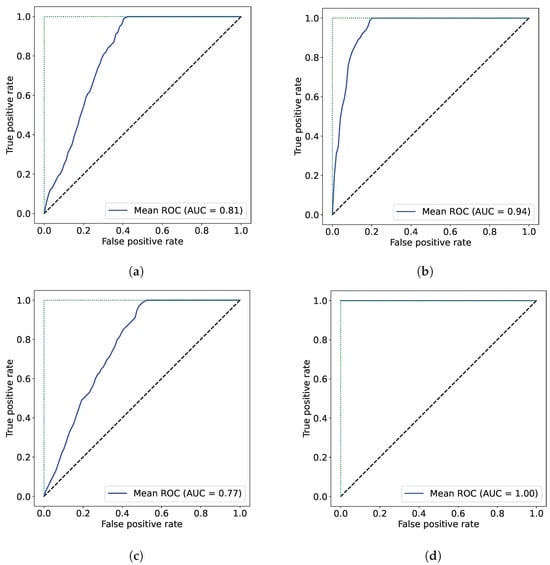 ROC curves of various applied approaches, highlighting the mean AUC. (a) ROC curve—discrimination results obtained in Sousa et al. 2019 study [5]. (b) ROC curve NIR—Approach 2. (c) ROC curve FTIR-ATR—Approach 1. (d) ROC curve FTIR-ATR—Approach 2.