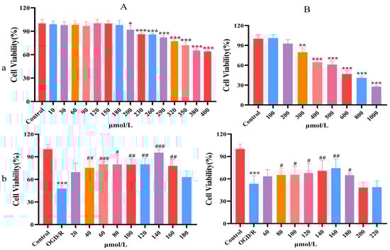 Confirmation of the non-toxic dose range and dosage of CAG and EDA. (A) CAG; (B) EDA; (a) non-toxic dose range; (b) dosage confirmation. (mean ± SD, n = 6) (* p < 0.05, ** p < 0.01, *** p < 0.001, compared with the control group; # p < 0.05, ## p < 0.01, ### p < 0.001, compared with the OGD/R group).