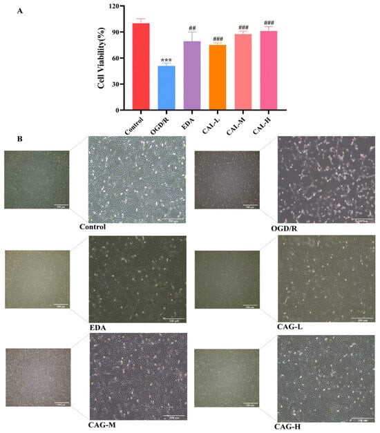 Cell viability and cell morphology. (A) The effect of CAG on OGD/R-injured HT22 cell viability was detected by the CCK-8 method. (B) Cell morphology (the scale bar for low magnification and high magnification is 500 μm and 200 μm, in that order). (*** p < 0.001, compared with the control group; ## p < 0.01, ### p < 0.001, compared with the OGD/R group) (mean ± SD, n = 6).