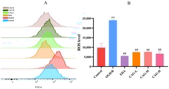 DCFH-DA is a probe that can freely cross the cell membrane and is hydrolyzed by esterase to produce DCFH in the cell. DCFH is then oxidized by ROS to produce DCF with fluorescence whose fluorescence intensity is proportional to intracellular ROS levels. Therefore, the ROS level can be analyzed by using flow cytometry to detect the fluorescence signal intensity in living cells. The most significant characteristic of oxidative stress is the excessive accumulation of ROS. The results proved that ROS levels of HT22 cells were considerably elevated after OGD/R injury compared with the control group (p < 0.01). Compared to the OGD/R group, CAG could significantly reduce ROS levels (p < 0.01). The results showed that CAG could effectively reduce the increase in the peroxidation level of nerve cells caused by cerebral ischemia, thus alleviating the oxidative stress response of neurons (see Figure 3).