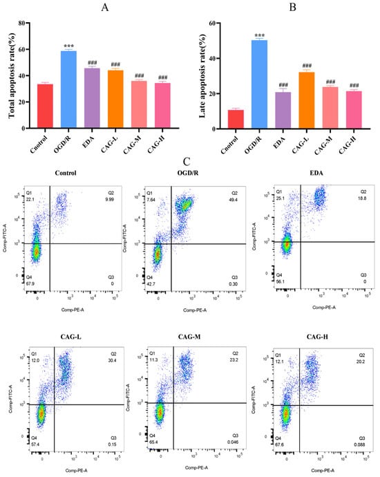 Figure 4 showed that in comparison to the control group, the apoptosis rate of HT22 cells in the OGD/R group was significantly increased (p < 0.001). Compared with the OGD/R group, HT22 cells’ apoptosis rate significantly decreased after CAG treatment (p < 0.001). With the increase in CAG concentration, the apoptosis rate decreased in a dose-dependent manner. After OGD/R injury, the late apoptosis rate of the cells increased most obviously (p < 0.001), and bare nucleus cells appeared. After EDA administration, the late apoptosis rate was significantly decreased (p < 0.001), but the early apoptosis rate was still high. Unlike the EDA group, CAG administration showed a downward trend in both early and late apoptotic rates, and the decrease in late apoptosis rate was more significant.