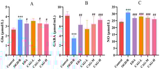 Concentration of Glu, GABA, and NO. (A) Glu; (B) GABA; (C) NO. (mean ± SD, n = 6). (*** p < 0.001, compared with the control group; # p < 0.05, ## p < 0.01, ### p < 0.001, compared with the OGD/R group).