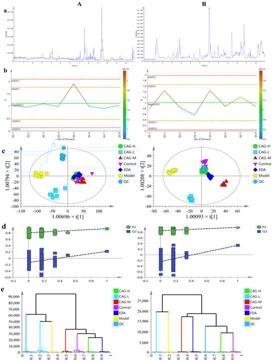 Multivariate statistics of cell metabolomics and metabolic profile analysis. (A) Positive ion mode; (B) negative ion mode; (a) BPC diagram (take QC as an example); (b) QC sample control diagrams; (c) OPLS-DA score scatter plot; (d) 200 iteration permutation test diagram; (e) cluster analysis plot.