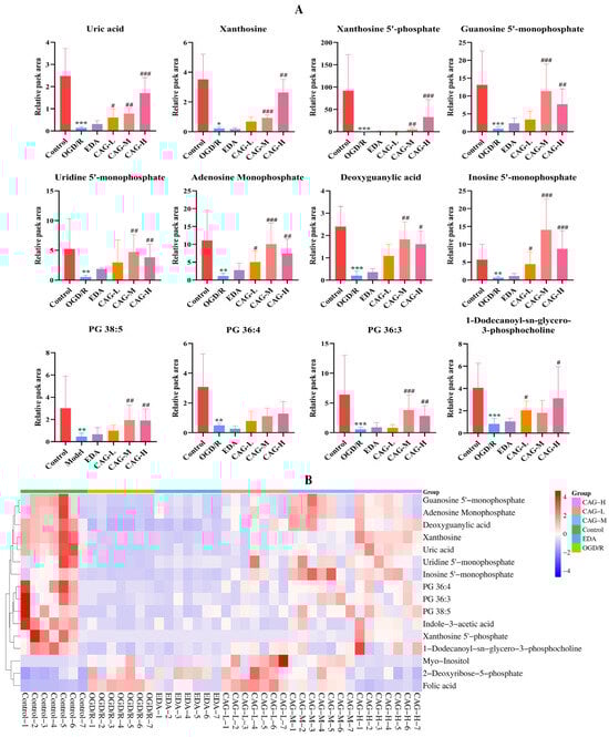 (A): Column bar graph of partial differential metabolites (mean ± SD, n = 7); (B) clustering heatmap of differential metabolite (the change of color scale indicates the trend of the relative expression level; the change of color scale under “Group” indicates different groups). (All metabolites in each group of samples are normalized to 3 × 106 cells). (* p < 0.05, ** p < 0.01, *** p < 0.001, compared with the control group; # p < 0.05, ## p < 0.01, ### p < 0.001, compared with the OGD/R group).