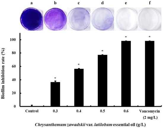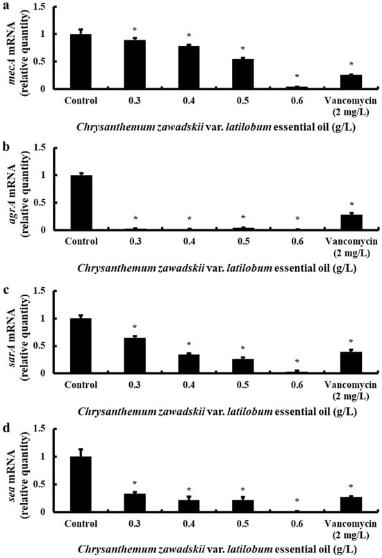 Chicago/Turabian StyleKim, Ji-Hee, Bog-Im Park, Young-Hoi Kim, Ji-Su Yoon, Na-Young Choi, and Kang-Ju Kim. 2025. "Chrysanthemum zawadskii var. latilobum Flower Essential Oil Reduces MRSA Pathogenicity by Inhibiting Virulence Gene Expression" Molecules 30, no. 3: 553. https://doi.org/10.3390/molecules30030553