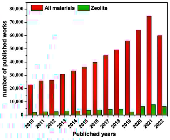 Zeolites, inorganic porous aluminosilicates, are particularly well-suited for wastewater treatment due to their outstanding thermal and chemical stability. Their high specific surface area, tunable pore structures, and abundant ion-exchange sites enable the efficient removal of toxic substances, including heavy metal ions, from water [25,26,27,28,29]. Both natural and synthetic zeolites have been extensively studied and proven effective for water pollutant adsorption [30,31,32,33,34]. Since 2010, research on zeolite-based adsorbents has grown significantly, emphasizing their potential in mitigating water pollution (Figure 1) [35]. Although the overall number of publications on wastewater adsorption declined between 2022 and 2024, studies focusing on zeolite-based adsorbents consistently accounted for approximately 9% of the total research output.