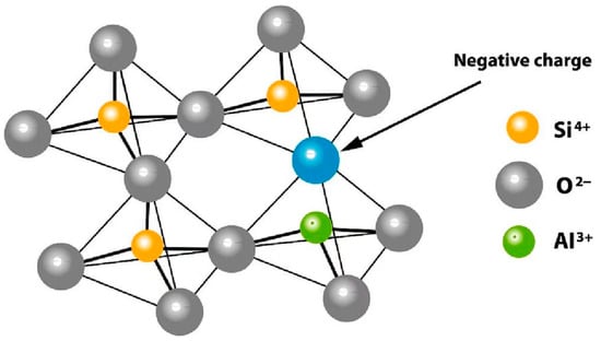 Zeolites were first identified in volcanic rocks by Swedish mineralogist Axel Fredrik Cronstedt, who observed that they released water vapor upon heating, resembling boiling. This phenomenon inspired the name “zeolite”. Zeolites are three-dimensional frameworks with uniform, molecular-sized pores, often referred to as molecular sieves. Their structure consists of interconnected TO4 tetrahedra (where T represents Si or Al), linked by oxygen atoms. The negative charge from [AlO4]− units in the framework is balanced by positive cations located within the pores (Figure 2) [45]. The general empirical formula for zeolites is Mx/n[(AlO2)x(SiO2)y]⋅wH2O, where M is an extra-framework cation with valence n, y/x represents the Si/Al ratio, and w denotes the number of water molecules.