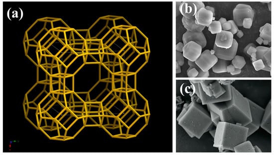 Zeolite A was the first synthetic zeolite to be commercialized [49]. In its Na+-exchanged form, it has the formula Na12[(AlO2)12(SiO2)12]·27H2O, with an Si/Al ratio of 1—the lowest among aluminosilicate zeolites. The Na+ ions within the structure are readily exchangeable [50]. The framework of zeolite A consists of two types of cages: α-cages and β-cages (also known as sodalite cages). Sodalite cages are connected through double four-membered rings (D4Rs), creating a three-dimensional network [37]. Eight sodalite cages fused by D4Rs form a larger α-supercage (Figure 3a). The type of cation present (e.g., K+, Na+, or Ca2+) influences the average channel size, leading to different zeolite designations: 3A, 4A, and 5A, respectively [51]. Zeolite A crystals typically exhibit a sharp-edged cubic morphology, as illustrated in Figure 3b,c.