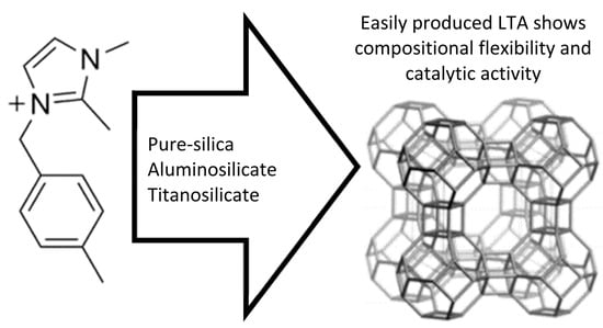 Previously, zeolite A with an Si/Al ratio greater than 1 (known as ZK-4) was typically synthesized using TMAOH as the OSDA in potassium (K+)-mediated systems [38,39,40,43,201,202]. However, these methods rarely produced zeolites with Si/Al ratios exceeding 3. Tao et al. successfully synthesized high-silica LTA zeolites with an Si/Al ratio of 6 by using tetramethylammonium, tetraethylammonium, and dimethyldiethylammonium as co-OSDAs [203]. The introduction of imidazolium-based OSDAs further advanced the synthesis of LTA zeolites, enabling Si/Al ratios of 10 or even higher. Hong’s group leveraged this approach to synthesize a series of high-silica LTA zeolites for applications such as NH3-SCR [204,205,206,207,208].