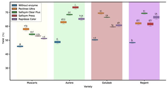 Furthermore, enzyme selection played an important role in determining the juice yield of each variety. For example, Pectinex Ultra produced the highest juice yields for the Muscaris and Golubok varieties, achieving yields of 57.98% and 69.41%, respectively. On the contrary, Safizym Press was most effective when added to the Aurora variety, resulting in a yield of 73.57%, while Safizym Clear Plus produced the highest juice yield for the Regent variety, reaching 69.30%. Therefore, selecting the appropriate enzyme based on the specific characteristics of the grape variety can significantly improve juice yield.