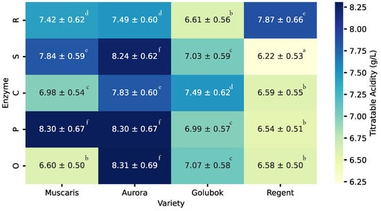 The addition of enzymes did not consistently increase or decrease the titratable acidity of the resulting juices. For example, the acidity of the juice obtained from the Aurora variety was significantly reduced by the addition of Safizym Clear and Rapidase color enzymes, while it remained relatively stable with the addition of Pectinex Ultra and Safizym Press enzymes. Similarly, the Golubok variety showed minimal changes in acidity with enzyme addition, except when Safizym Clear was applied. For the Regent variety, the addition of enzymes did not generally have a significant effect, although Rapidase color increased the acidity to 7.87 g/L. In contrast, the Muscaris variety exhibited significant increases in titratable acidity regardless of the enzyme types. These findings suggest that targeted enzyme applications can effectively modulate titratable acidity levels based on the grape variety and desired product characteristics.