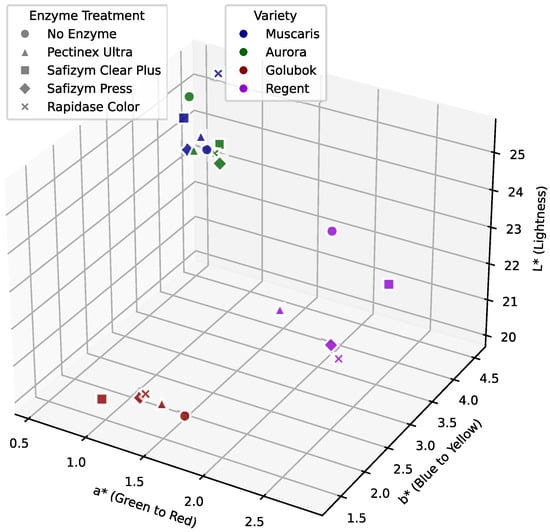 Furthermore, the enzyme treatment also influenced the color change in the grape juices, particularly in terms of the *a and *b values. For instance, Pectinex Ultra (P) tended to push the *a values higher, particularly in Regent (RP, RC) and Golubok (GP), indicating a shift toward more red hues. Furthermore, Safizym Clear Plus (C) appeared to result in slightly lower *a values for Muscaris (MC) and Aurora (AC), possibly resulting in a more neutral or less intense color. Rapidase color (R) appears to enhance the *a and *b values, resulting in deeper color shades in red grapes such as Regent (RR) and Golubok (GR).