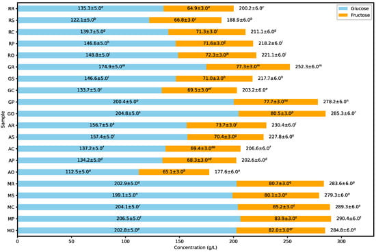 16] observed in grape juices, which was that grape juices contain only glucose and fructose. Glucose concentrations are higher than fructose, ranging from 112.5 g/L to 204.8 g/L and 64.9 g/L to 85.2 g/L, respectively.