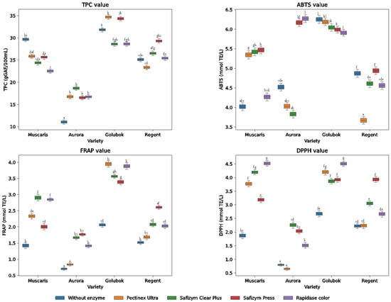 Regarding the antioxidant capacity measured by ABTS, the Golubok variety juices exhibited the highest values, ranging from 6.0 to 6.35 mmol TE/L. On the contrary, without enzyme addition, the Aurora variety had the lowest ABTS value at 4.62 mmol TE/L. Interestingly, when enzyme treatments such as Safizym Press or Rapidase color were added, the Aurora ABTS value increased significantly to 6.27 mmol TE/L and 6.37 mmol TE/L, respectively. A similar increase was observed in Muscaris and Regent varieties juices, but enzyme treatment did not significantly affect the ABTS value in Golubok juices.
