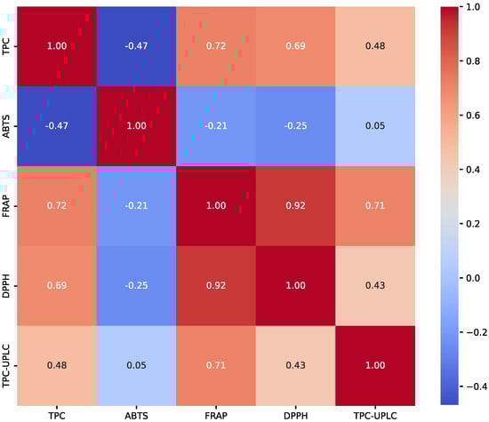 Figure 7 presents a correlation matrix illustrating the relationships between total polyphenol content, determined by the Folin–Ciocalteu method and UPLC, and antioxidant activities measured using the ABTS, FRAP, and DPPH assays. The data show that most parameters exhibited positive correlations. The strongest correlation was observed between FRAP and DPPH (0.92). Similarly, TPC and FRAP show a high positive correlation (0.72). However, ABTS displayed negative correlations with most assays, which may reflect differences in how this assay evaluates antioxidant capacity. Zubaidi et al. [