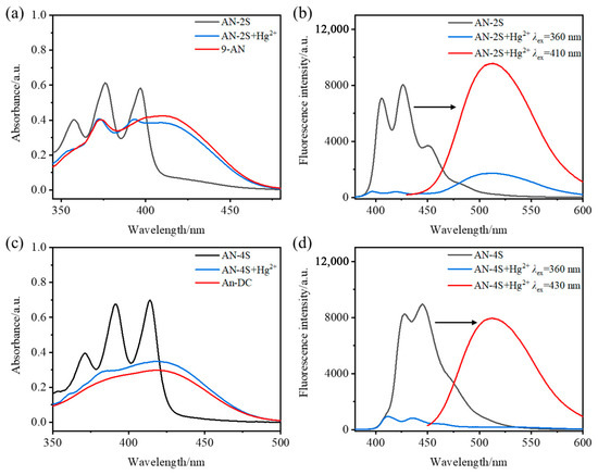 The operating wavelength and detection mode of the probe were determined using the UV–vis absorption and fluorescence emission spectra before and after the reaction. As shown in Figure 2, AN-2S and AN-4S had obvious UV absorption peaks in the range of 360~430 nm, which corresponded to fluorescence emission at 400~475 nm. Upon rapid reaction with excess Hg2+, the probe exhibited a significant decrease in its original absorption peak. Concurrently, a new absorption peak attributed to anthracene emerged within the 410~430 nm range, which correlated with the fluorescence emission peak observed between 510 and 530 nm. The spectra before and after the reaction showed obvious redshift, and the stokes shift was between 80 and 100 nm, which helped to improve the signal-to-noise ratio and ensure the accuracy and reliability of experimental results. As shown in Table 1, the probes had “turn-off” and “turn-on” detection modes according to the change in the fluorescence emission before and after the reaction, which can detect Hg2+ at different excitation wavelengths (λex).