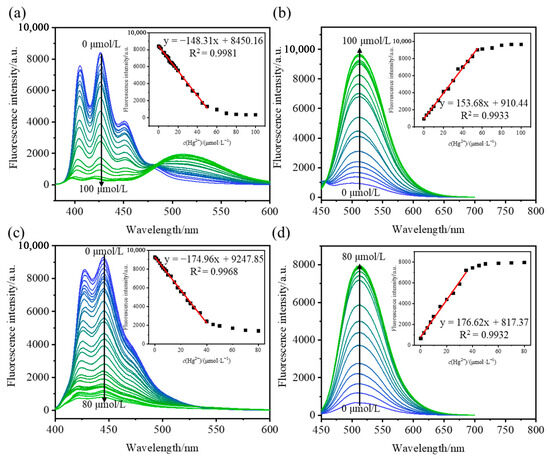 Fluorescence titration experiments were conducted to draw the fitting curves of AN-2S and AN-4S in different detection modes. As shown in Figure 3, both probes (100 μmol/L) exhibited a linear response to varying Hg2+ concentrations over a wide range in both the “turn-off” and “turn-on” detection modes. The working curves under the different detection modes can be obtained by fitting the Hg2+ concentration as the abscissa and the fluorescence intensity as the ordinate. According to the standard detection of limit (LOD) formula [34]