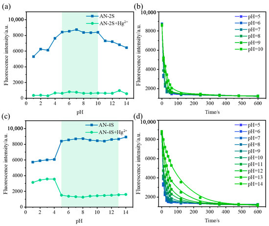 Fluorescence response of (a) AN-2S (λex = 360 nm, c(AN-2S) = 100 μmol/L, c(Hg2+) = 100 μmol/L) and (c) AN-4S (λex = 360 nm, c(AN-4S) = 100 μmol/L, c(Hg2+) = 200 μmol/L) under different pH conditions; impact of time on the fluorescence intensity of (b) AN-2S (λex = 360 nm, c(AN-2S) = 100 μmol/L, c(Hg2+) = 100 μmol/L) and (d) AN-4S (λex = 360 nm, c(AN-4S) = 100 μmol/L, c(Hg2+) = 200 μmol/L) for Hg2+ under different pH conditions.