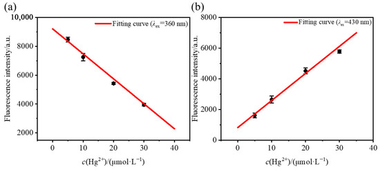 the LOD of the probe under different detection modes can be calculated, where σ is thestandard deviation of 20 measurements of the blank response, and S is the slope of the fitting curve (Table 2). According to the calculation results, the two probes had lower detection limits in the “turn-on” mode, and the lowest LOD reached 4.9 × 10−8 mol/L. The detection limit in the “turn-off” mode was slightly higher, around 2.5 × 10−7 mol/L. According to China’s Sanitary Standards for Drinking Water, the concentration of Hg2+ in surface water should not exceed 0.05 mg/L (2.5 × 10−7 mol/L) [35]. Therefore, the LODs of the two probes in different detection modes were lower than the maximum allowable concentration of Hg2+ in surface water in China, which could be used to detect Hg2+ in water.