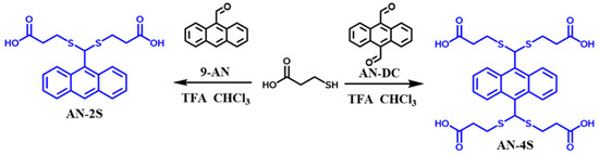 9-Anthraaldehyde (9-AN, purity: 99.0%), 9, 10-anthradialdehyde (AN-DC, purity 99.0%), 4-mercaptopropionic acid (purity: 99.0%) and trifluoroacetic acid (TFA, purity 99.0%) were purchased from Bide Pharmatech Ltd. (Shanghai, China). Trichloromethane (purity: 99.0%), anhydrous magnesium sulfate (purity: 98.0%), N, n-dimethylformamide (DMF, purity: 99.0%), sodium hydroxide (NaOH, purity: 96.0%), hydrochloric acid (HCl, purity: 36.0–38.0%) and phosphate buffer (PBS, purity: 98.0%, pH = 7.4) were purchased from Sinopharm Chemical Reagent Co., Ltd. (Beijing, China). The instruments used were an AVANCE III HD-400 Nuclear Magnetic Resonance (NMR) Spectrometer (Bruker, Billerica, MA, USA); AB SCIEX 5800 Matrix-Assisted Laser Desorption Time-of-Flight Mass (MALDI-TOF) Spectrometer (SCIEX, Framingham, MA, USA); Cary 6000i Ultraviolet–Visible (UV–vis) Spectrophotometer (Agilent Corporation, Santa Clara, CA, USA); RF-5301PC Fluorescence (FL) Spectrometer (Shimadzu, Kyoto, Japan); and Nicolet 670 Fourier Transform Infrared (FT-IR) Spectrometer (Thermofisher, Waltham, MA, USA).