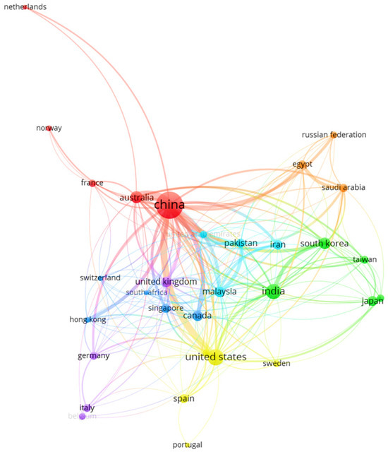 In this regard, the correlation map, as shown in Figure 2, illustrates that China, the United States, the United Kingdom, and India have the highest level of global collaboration, as evidenced by seven clusters, reflected in the nodes’ proximity and size. This finding highlights the growing concern about the impact of CO2 emissions on the environment, as their accumulation contributes to the greenhouse effect and global warming, phenomena that lead to droughts, intense storms, accelerated glacier melting, and repercussions on public health and ecosystems. The bibliometric map, as shown in Figure 2, illustrates the clusters or nodes represented by colors that facilitate the visual identification of the thematic areas within the analyzed data set. The connecting lines that join the nodes indicate their relationships, such as co-authorships. The thickness of these lines varies, reflecting the strength or relevance of the relationship; thicker lines suggest stronger connections, while thinner lines indicate less significant interactions. In this context, three distinct groups emerge: the first group, represented in red, is led by China, which has 323 publications, a total link strength of 152, and 28 links.