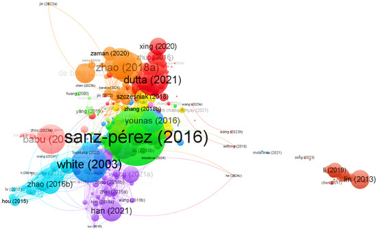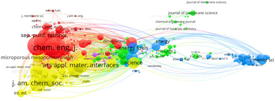 Figure 3, created with VOSviewer [31], presents a co-citation map between various scientific journals. In this map, the thickness of the lines connecting the nodes (representing journals) indicates the level of co-citation between them. The size of each node reflects the overall strength of the journal, while the thickness of the lines connecting the nodes represents the intensity of co-citation. Similarly, the colors representing the nodes or clusters in the analyzed data indicate the journals that publish similar studies, scope, and fields. As can be seen, the Chemical Engineering Journal and ACS Applied Materials & Interfaces show strong co-citation and notable proximity in the map, suggesting a close thematic relationship between the two. A similar pattern is observed between the journals Energy & Fuels and Fuel, which also exhibit solid collaboration with the previously mentioned journals. Furthermore, both the Journal of Membrane Science and Science and Langmuir are highly cited, indicating their relevance in the field of study. As shown in Figure 3, the proximity of the nodes and the total link strength reflect the cooperation in research focused on CO2 capture.